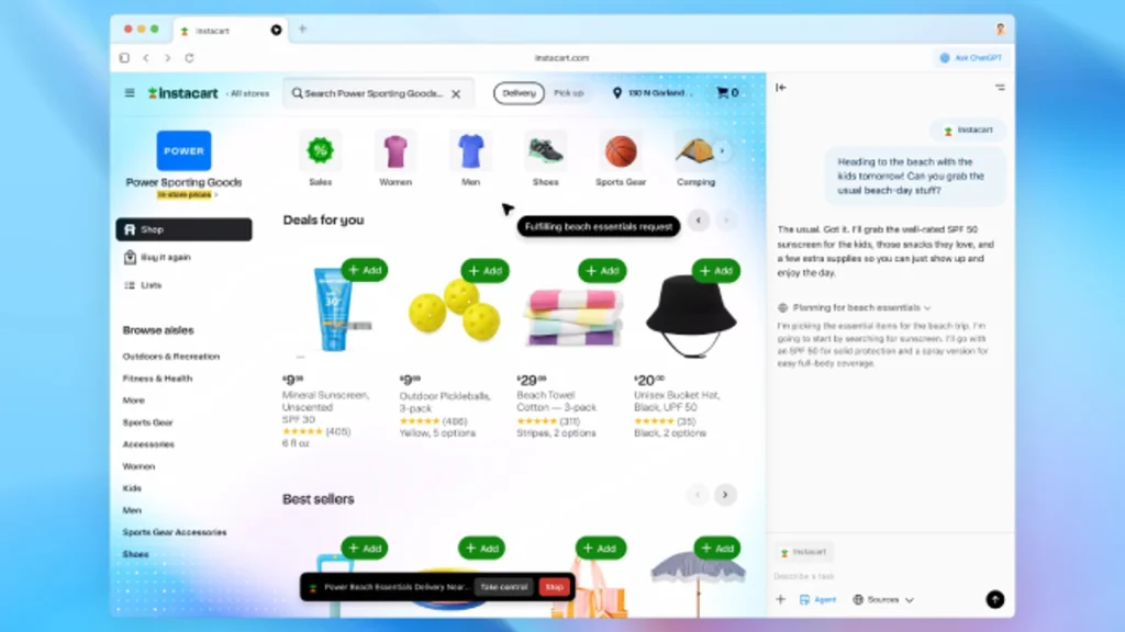 - Modo agente: los usuarios de planes de pago (Plus, Pro o Business) pueden permitir que el navegador ejecute tareas automáticas, como realizar búsquedas, comparar productos o completar formularios.