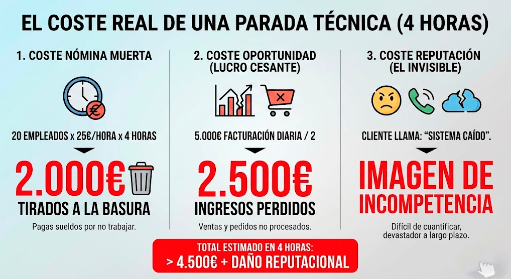 En 2026, la dependencia tecnológica es absoluta. Si el sistema cae, la producción es cero. Para calcular el coste real de una incidencia, debes sumar tres variables que suelen permanecer ocultas: